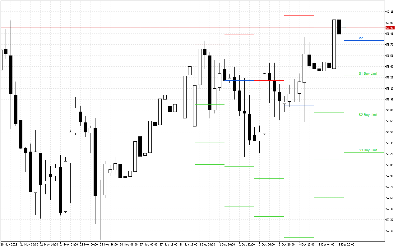 PP: 6010.23;S1: 5988.57; S2: 5946.23; S3: 5924.57;R1: 6052.57; R2: 6074.23; R3: 6116.57.