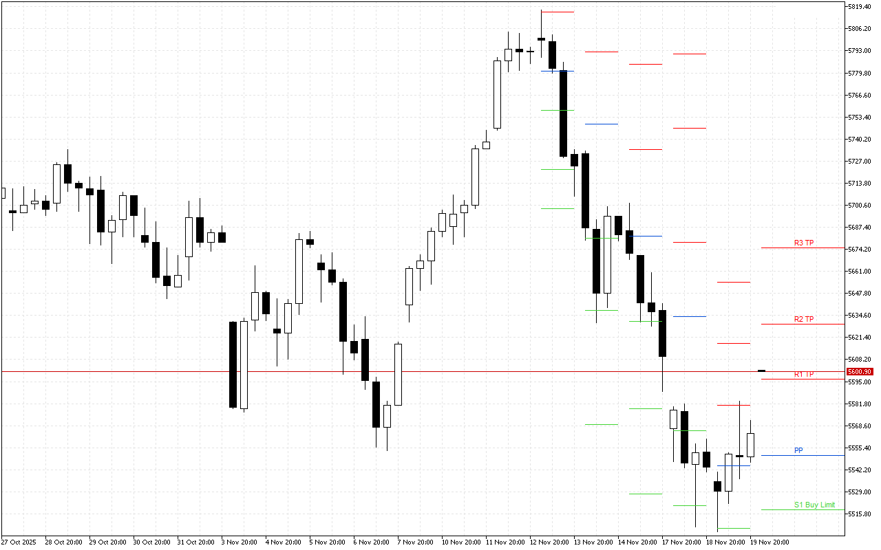 PP: 5633.73;S1: 5565.47; S2: 5520.83; S3: 5452.57;R1: 5678.37; R2: 5746.63; R3: 5791.27.