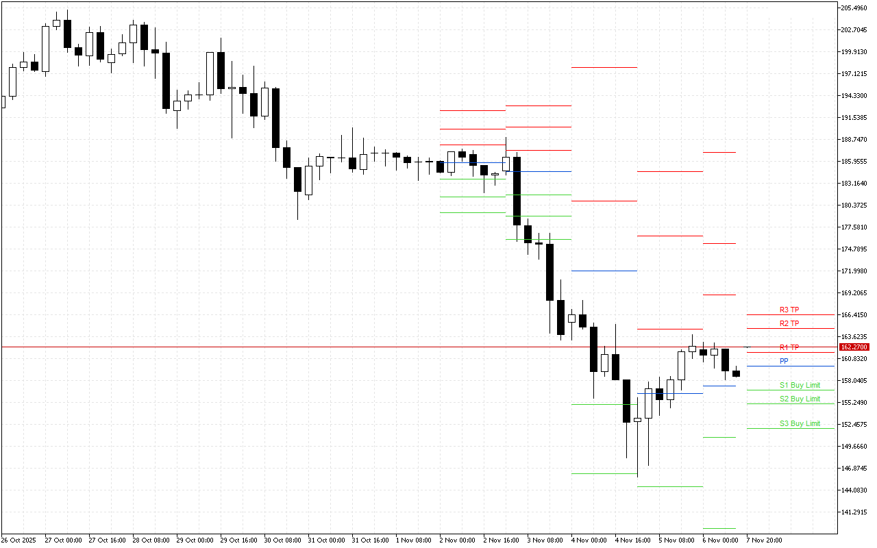 Titik masuk harus dipertimbangkan pada tahap PP dan apabila harga kembali ke kawasan tahap rintangan yang ditandakan dengan merah. Urus niaga ditutup apabila harga mencapai tahap S1, S2, S3.