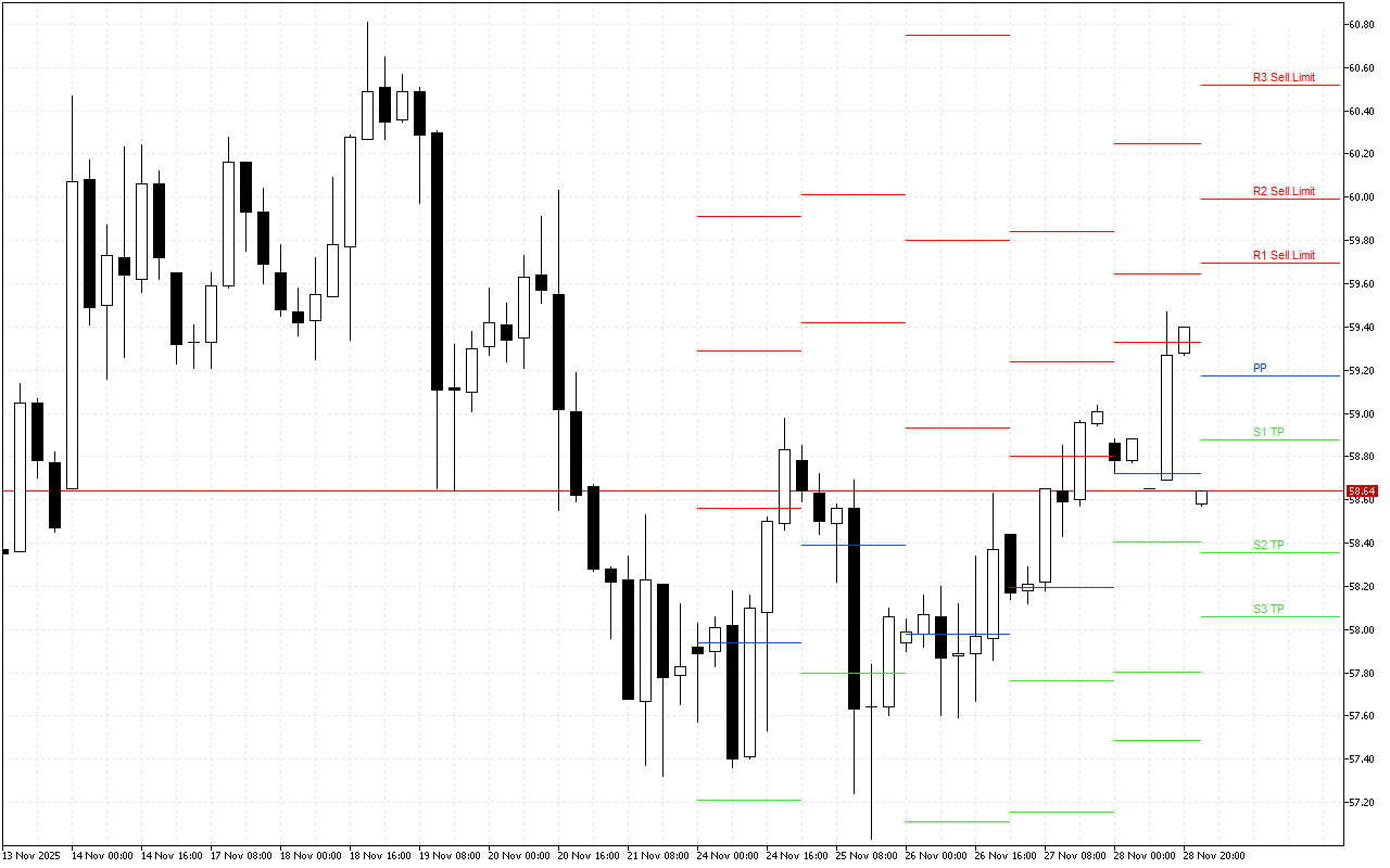 Sadarkaaleen deeggarsa, chaartii irratti magariisa mallatteeffaman, sadarkaa S1 128.5833, S2 124.6667, fi S3 118.6033 irratti argamu.