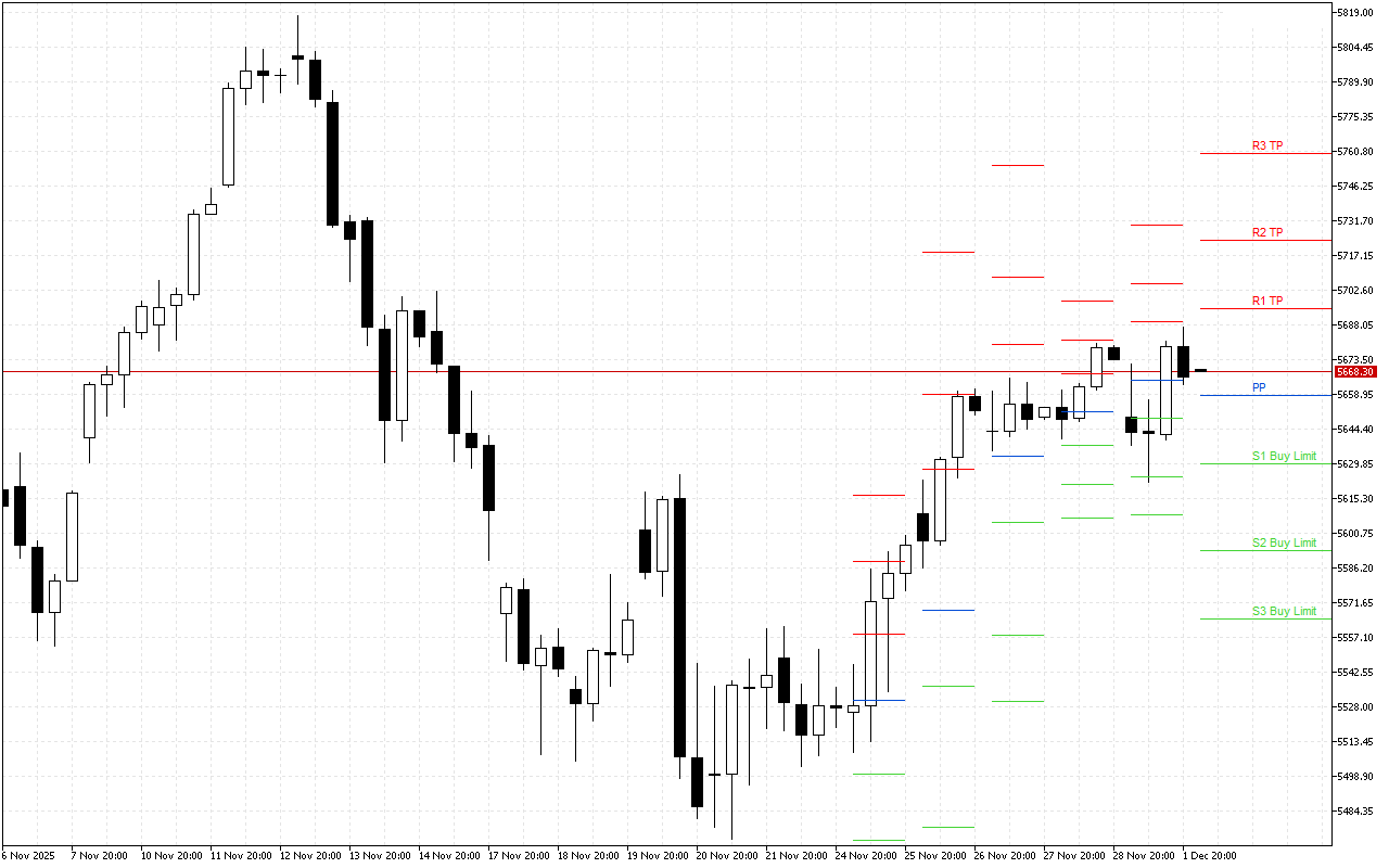 Текущая отметка уровня Pivot Points составляет 5718.67. С открытием рынка выше этого уровня становится более вероятным преобладание позитивных настроений. Поэтому в течение дня приоритет отдаётся открытию длинных позиций.