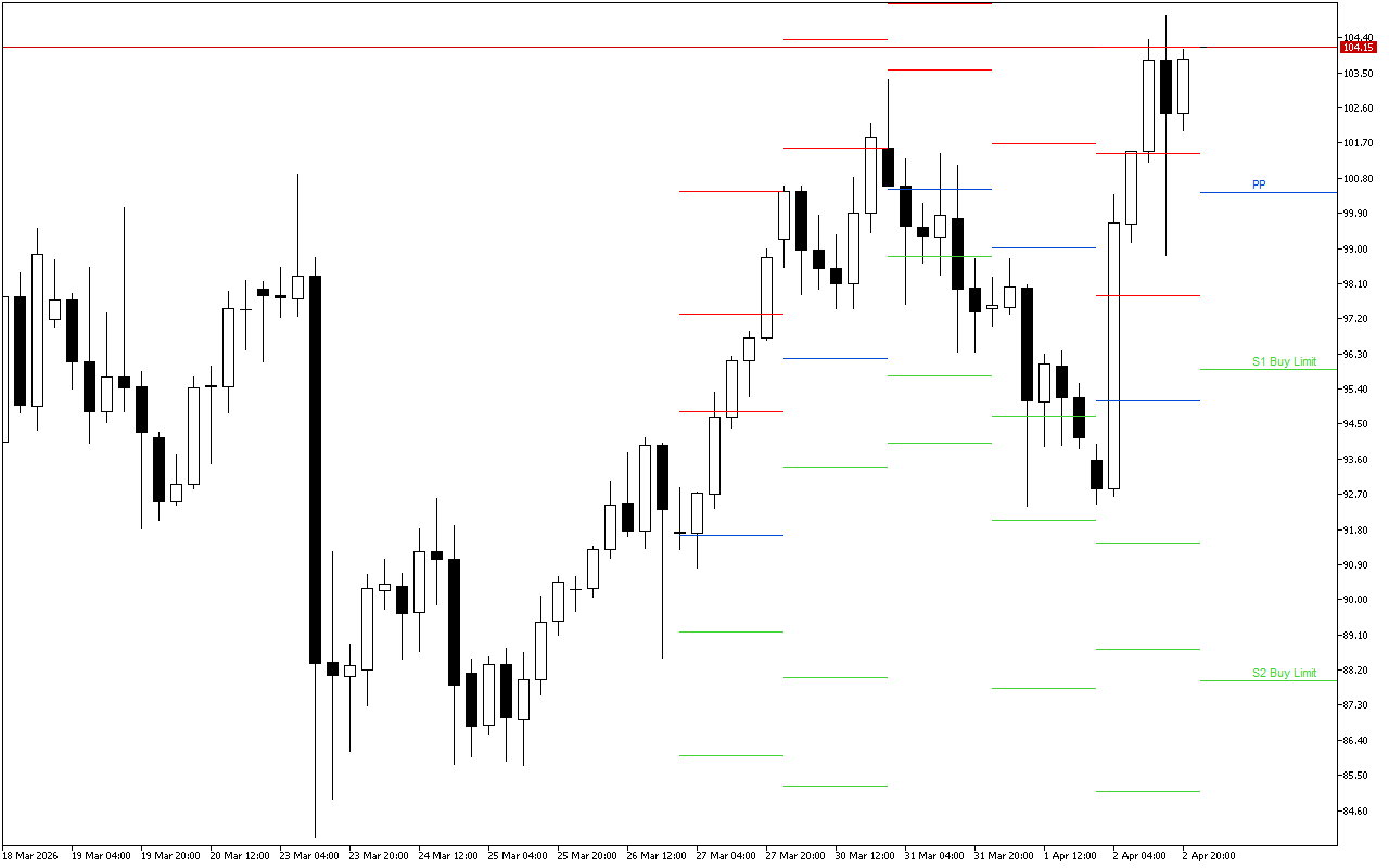 Awọn aaye titẹsi yẹ ki o gbero ni ipele PP ati nigbati idiyele ba yipo pada si agbegbe awọn ipele resistance ti o samisi pẹlu pupa. Iṣowo naa tilekun nigbati idiyele ba de awọn ipele S1, S2, S3.